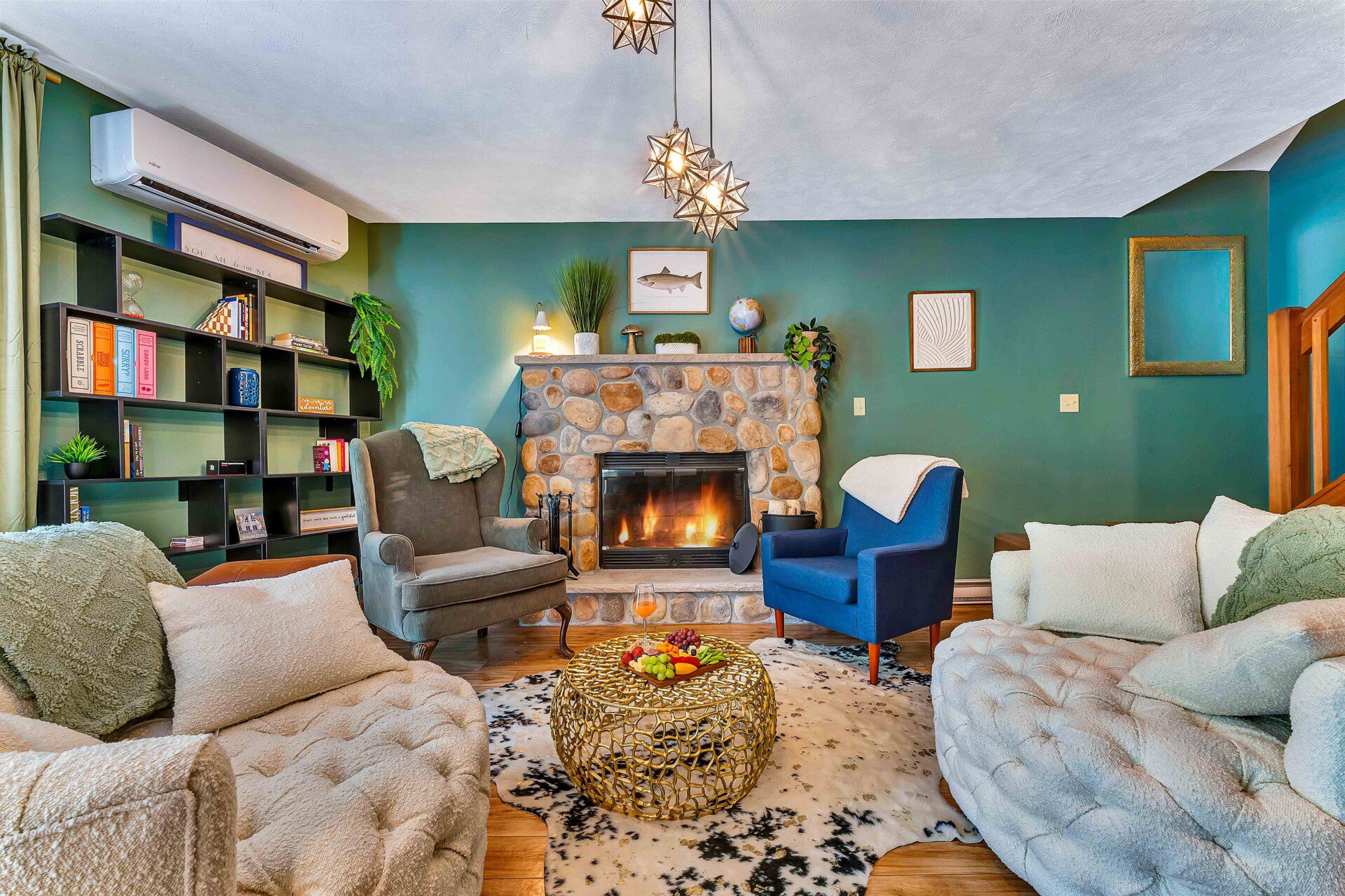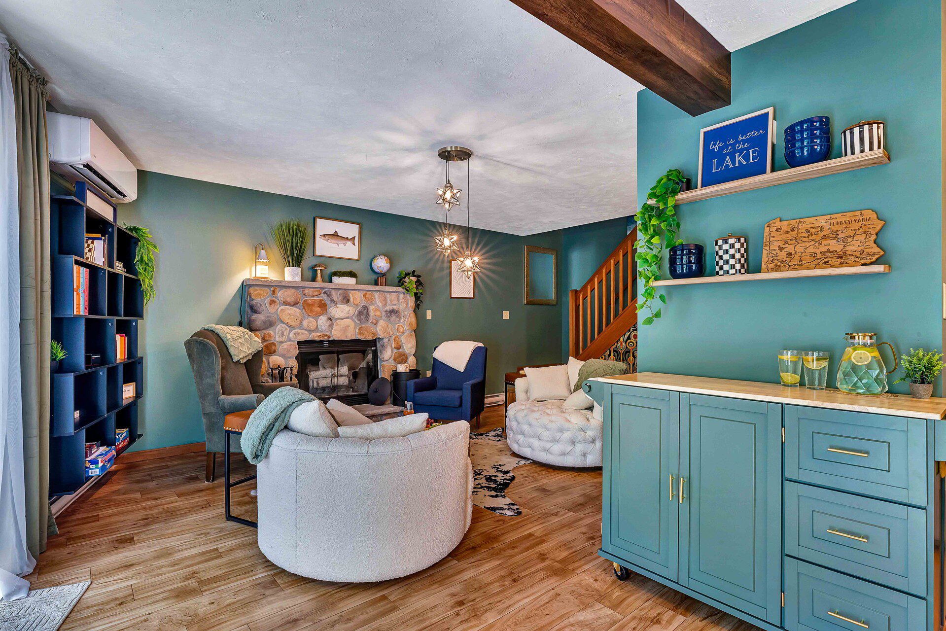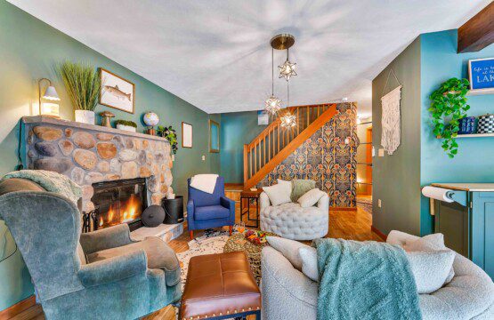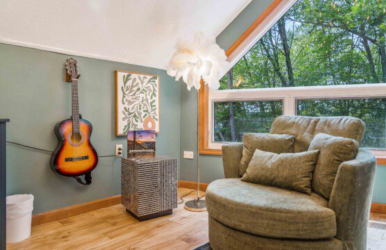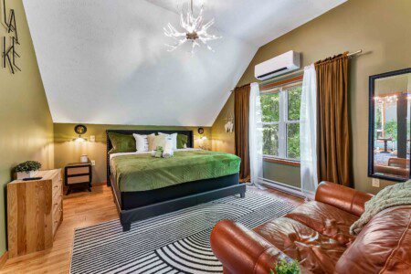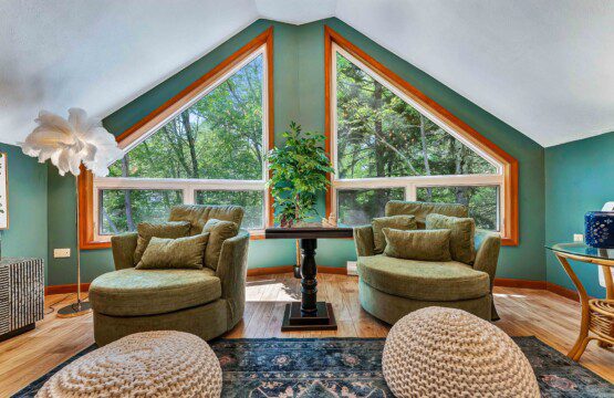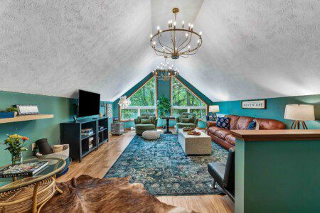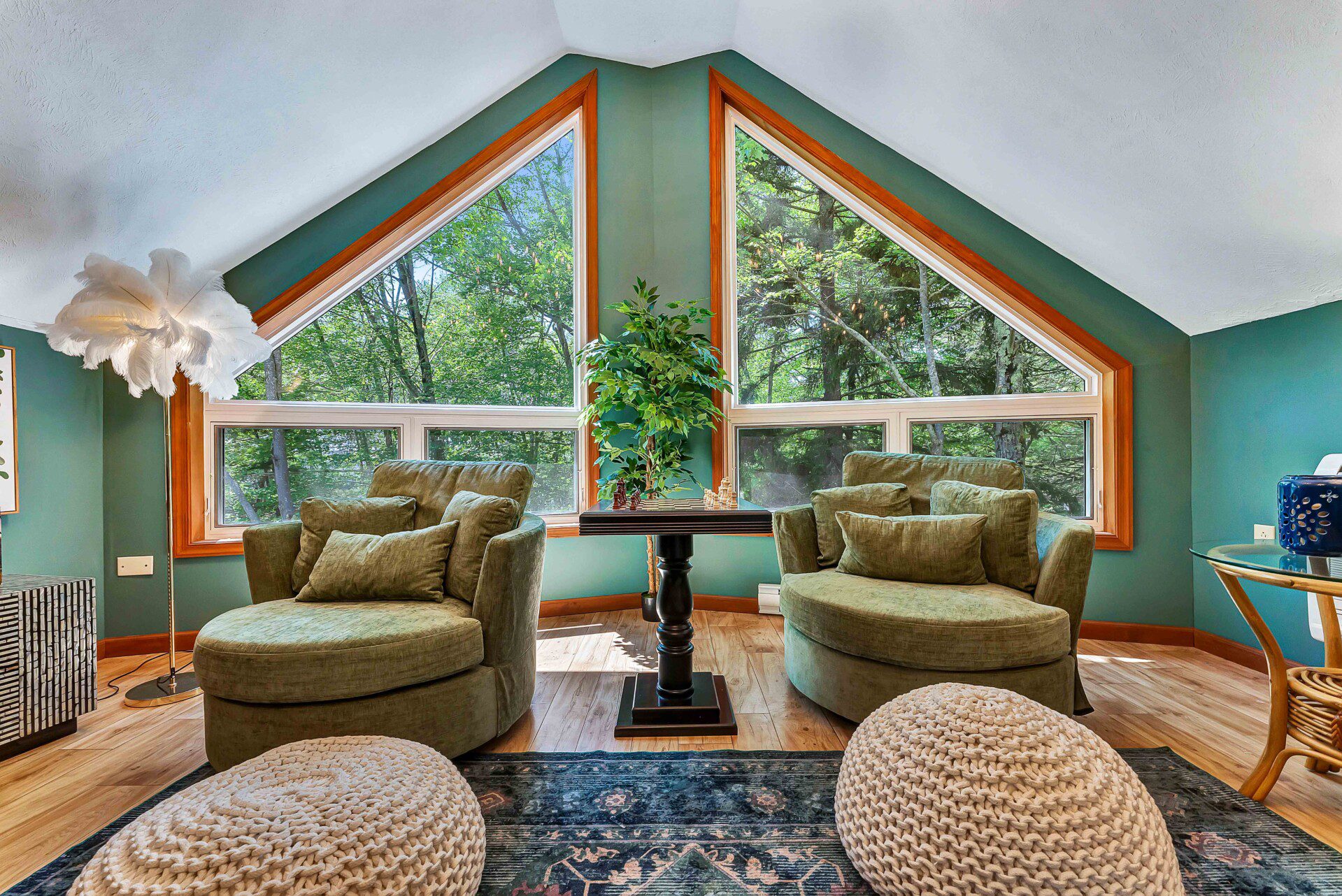 Bathed in natural light through stunning A-frame windows, this cozy retreat offers lake views (depending on the season), a charming chess table, comfy lounge seating, and vintage design details that make it feel like a magazine spread.