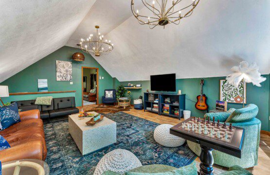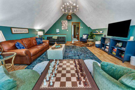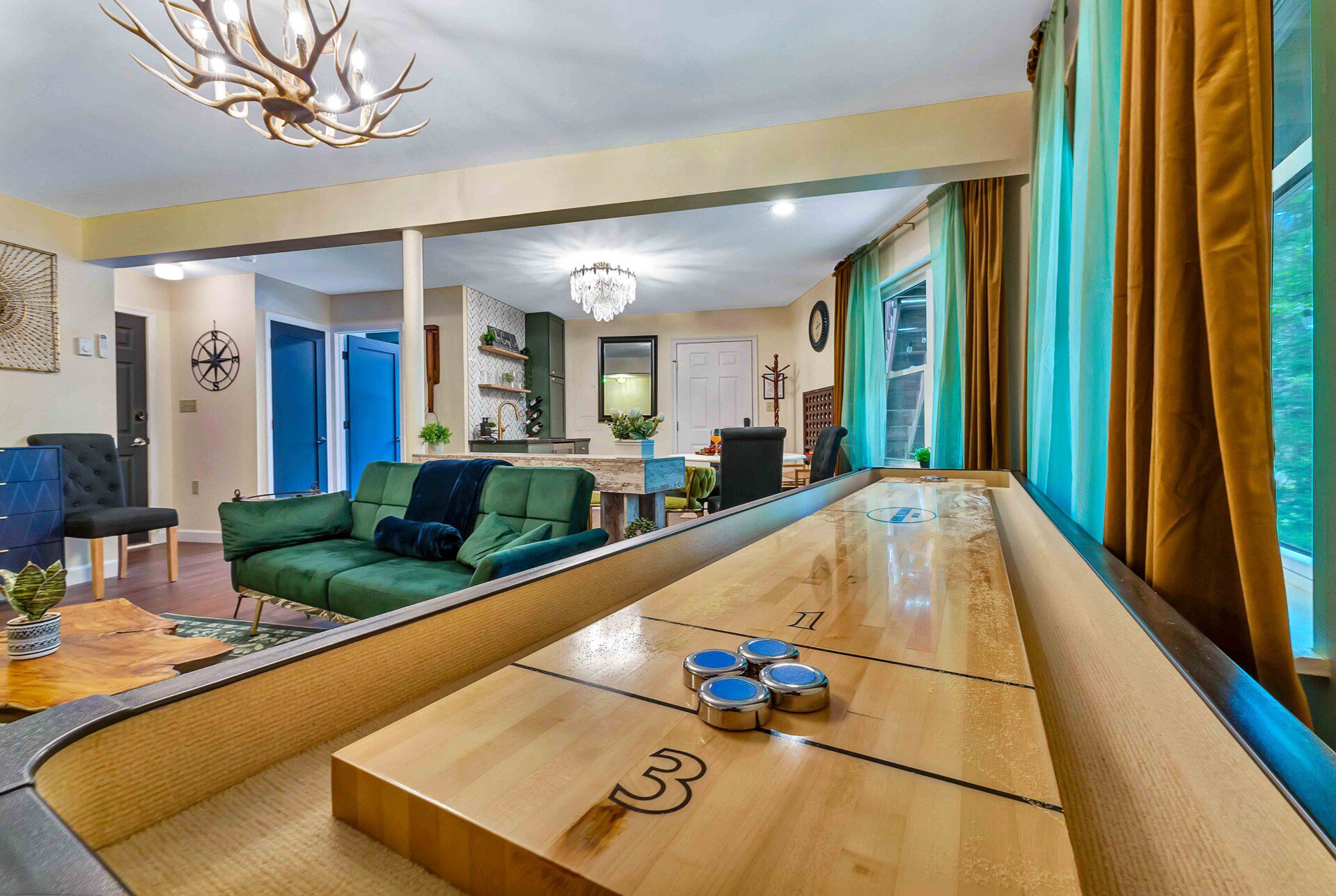 Designed for fun and connection, this vibrant space features a wet bar, plush seating, a full dining table, giant Connect Four, shuffleboard, board games, and a 55″ Smart TV—perfect for family game nights or rainy-day hangouts.