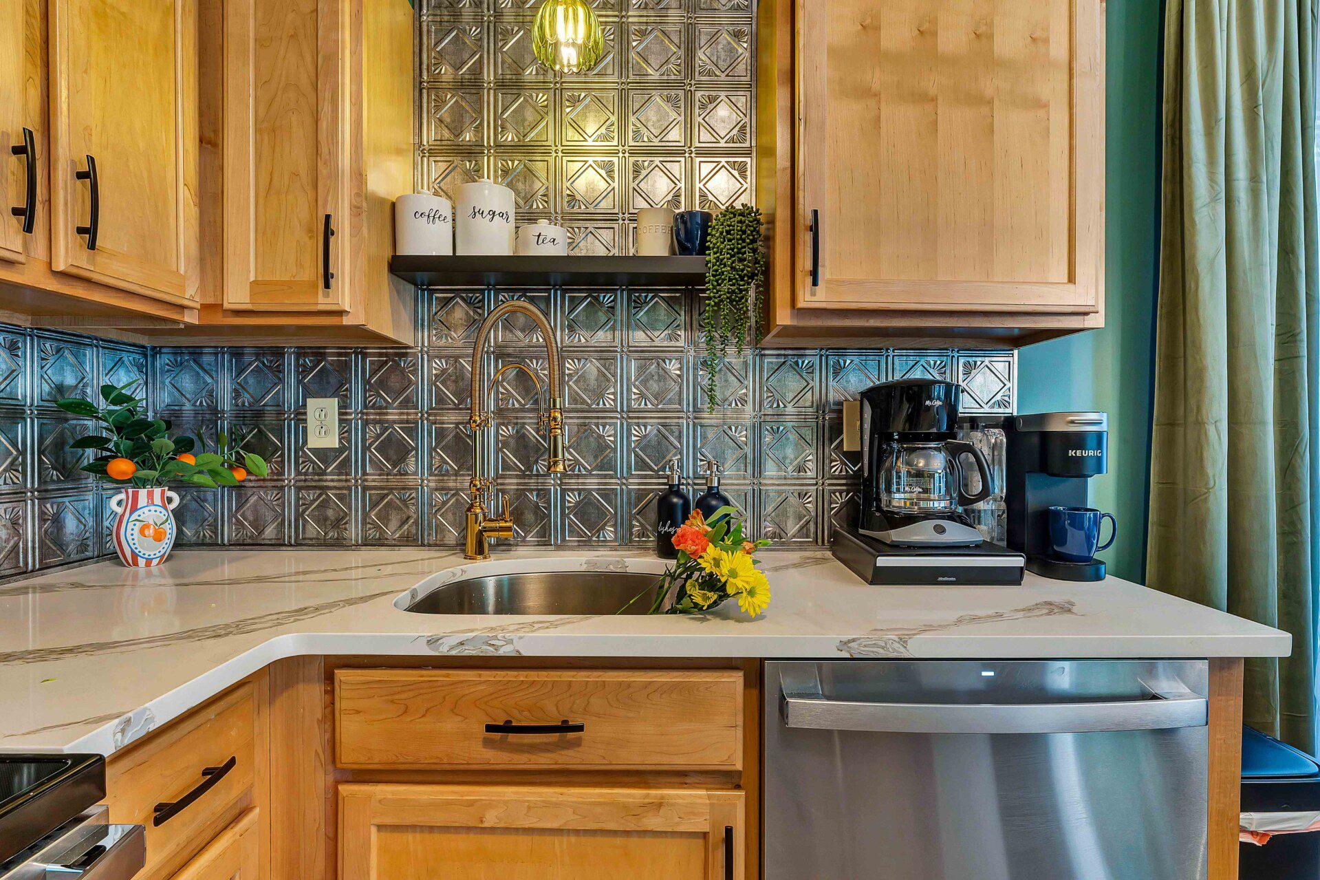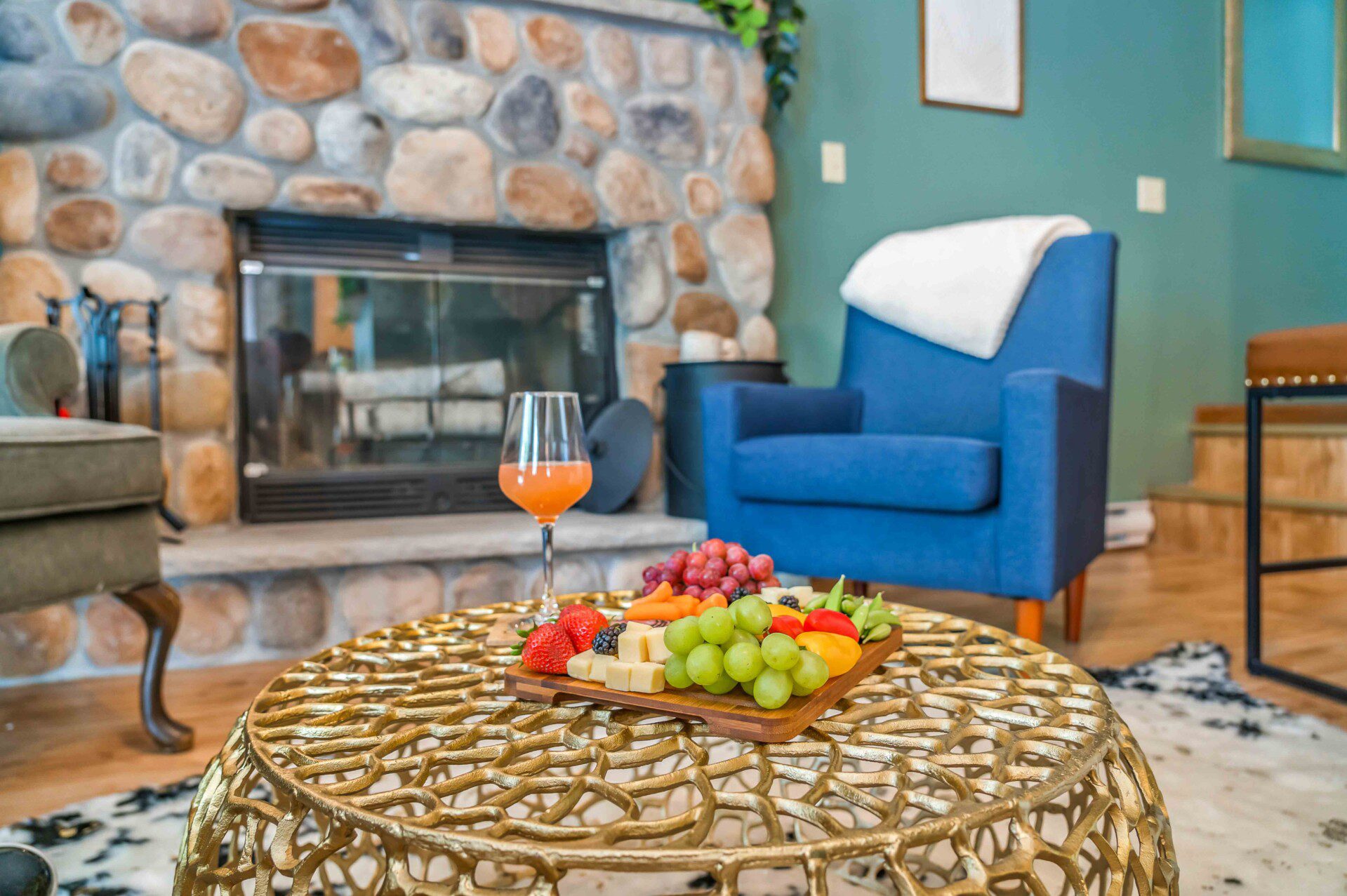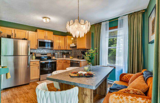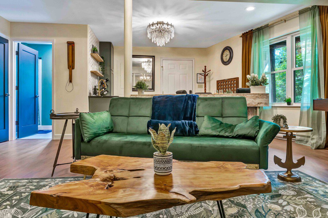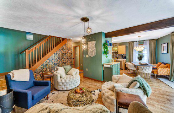 Step into our modern-vintage kitchen, where gold fixtures, open shelving, and thoughtful design meet functionality. Whether you’re whipping up a quick breakfast or hosting a family-style dinner, you’ll have everything you need to make it memorable. The main dining area features plush seating, with additional dining spaces throughout the home to comfortably accommodate larger groups.
