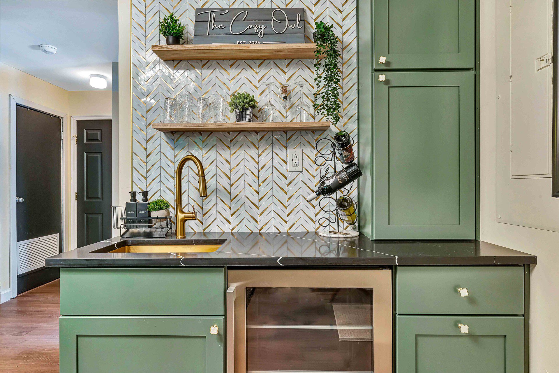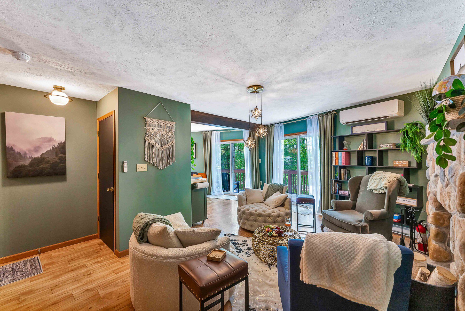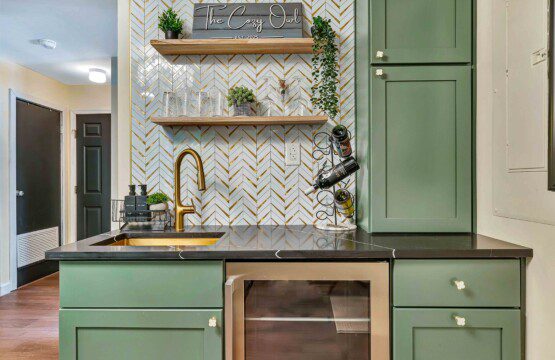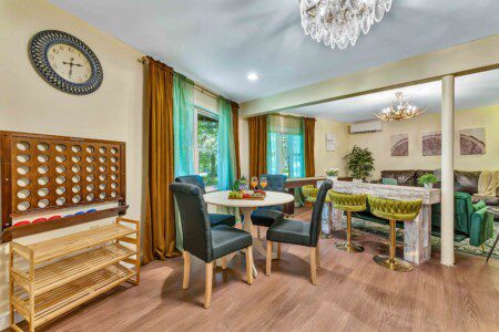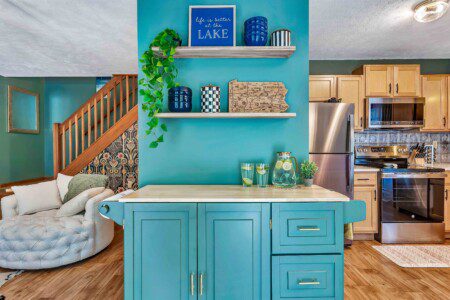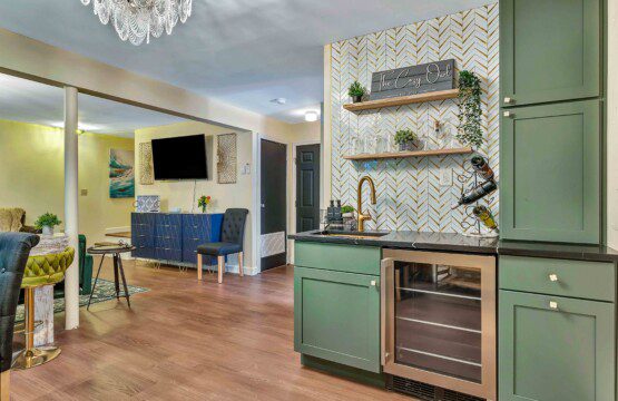 Step into our modern-vintage kitchen, where gold fixtures, open shelving, and thoughtful design meet functionality. Whether you’re whipping up a quick breakfast or hosting a family-style dinner, you’ll have everything you need to make it memorable. The main dining area features plush seating, with additional dining spaces throughout the home to comfortably accommodate larger groups.