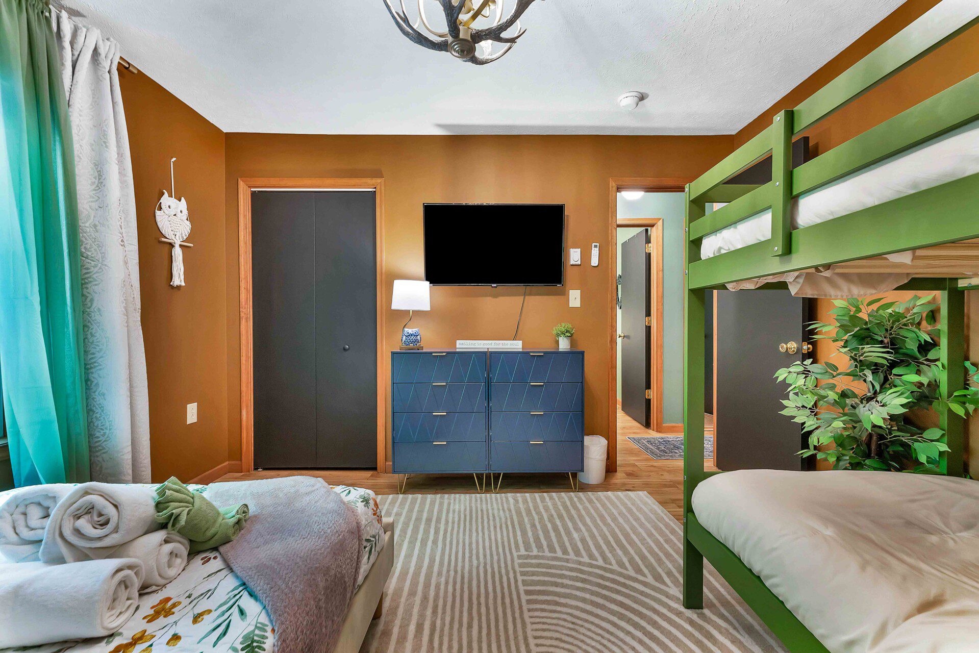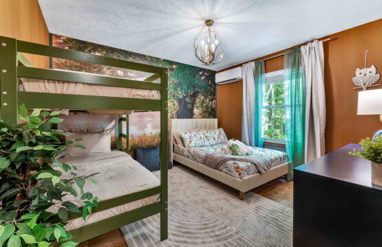 Each bedroom is thoughtfully themed for relaxation and joy, from forest murals to floral bedding and plush lounge chairs. Perfect for recharging after a fun-filled day.