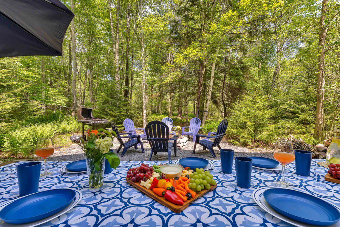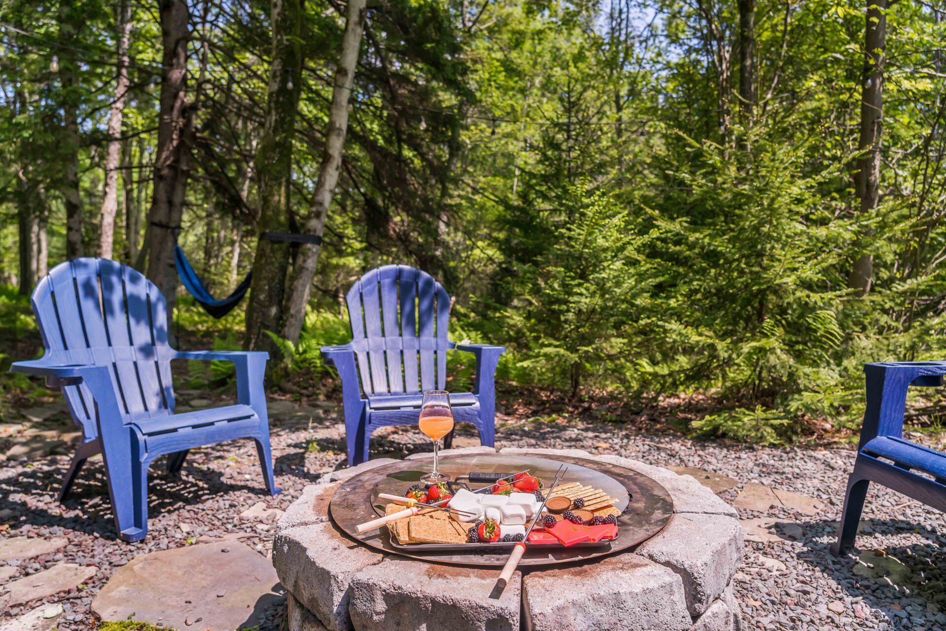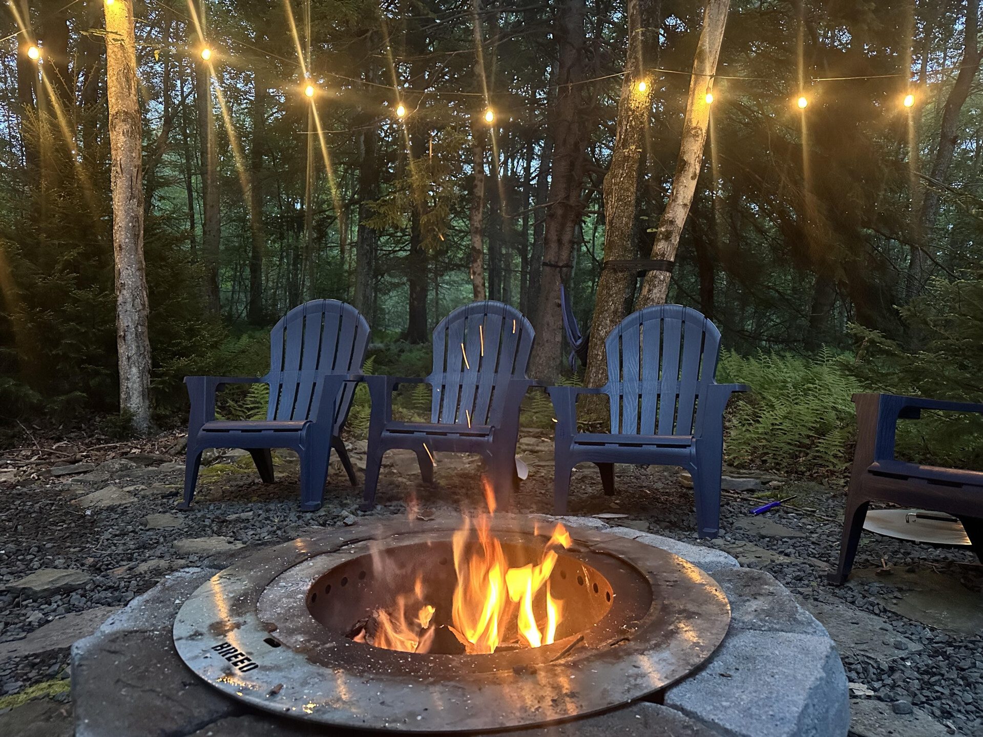 Step outside into a peaceful woodland setting. Gather around the firepit under glowing string lights and enjoy relaxed evenings surrounded by tall trees and fresh mountain air. Sip coffee on the deck in the quiet morning light, or take a short walk to the lake just one block away. Adirondack seating, a charcoal grill (weather permitting), and the wood-burning firepit create the perfect setting for laid-back evenings under the stars.