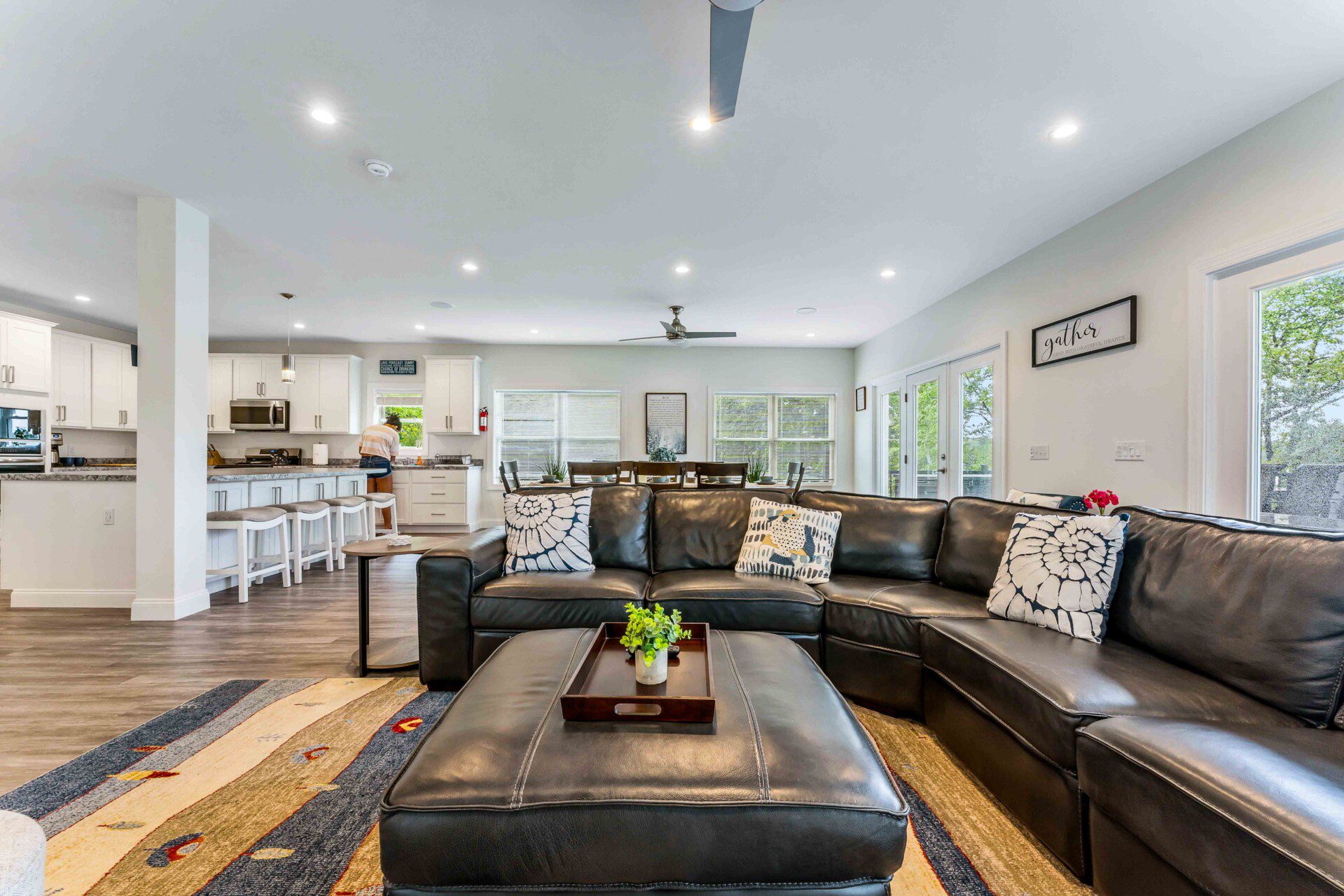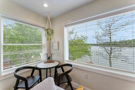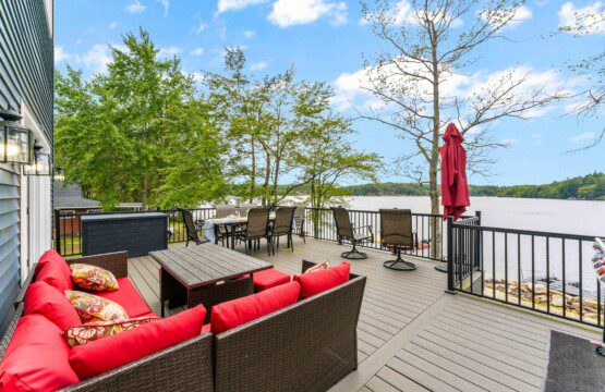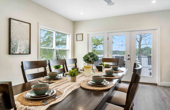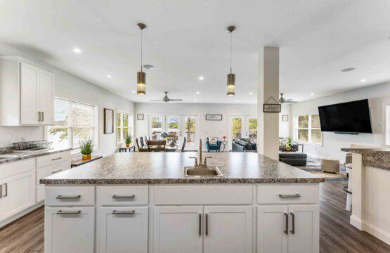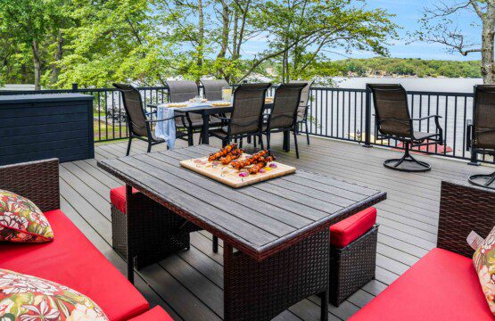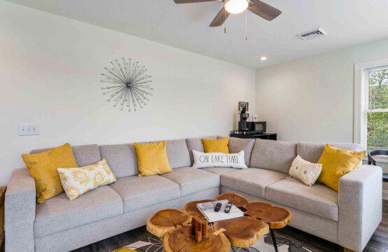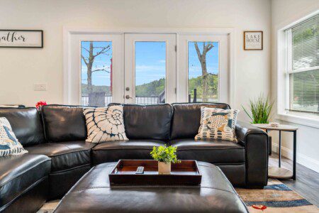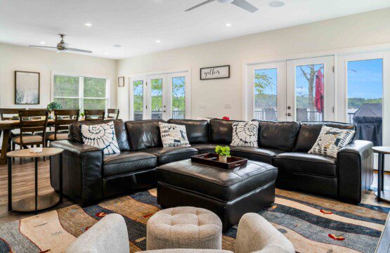 The heart of the home is a bright, open-concept living space featuring floor-to-ceiling sliding glass doors that open directly onto the back deck — giving you lake views from inside year-round. Lounge in comfort with a massive 85″ smart TV, cozy sectional, and plenty of room for group movie nights or board games.