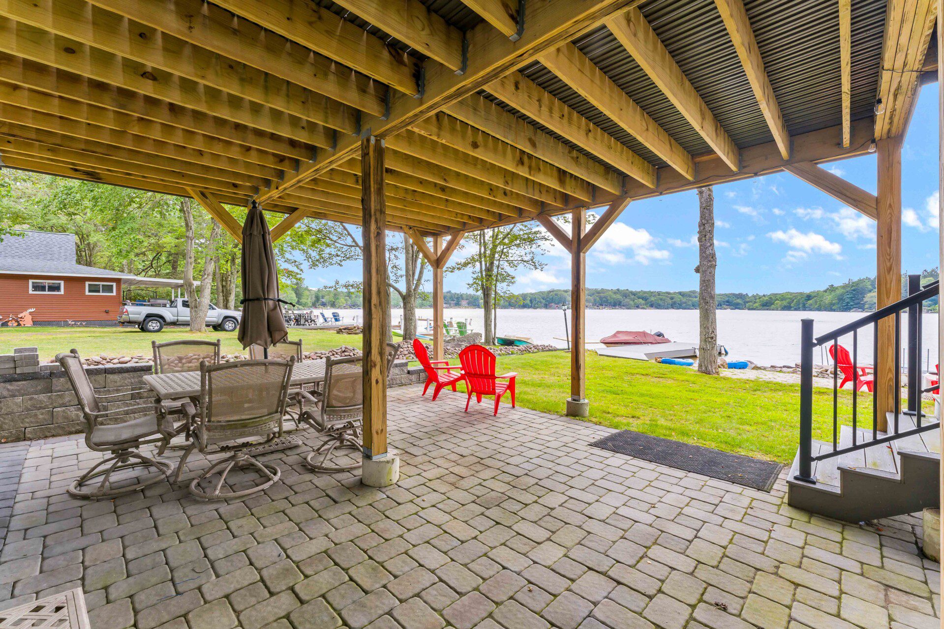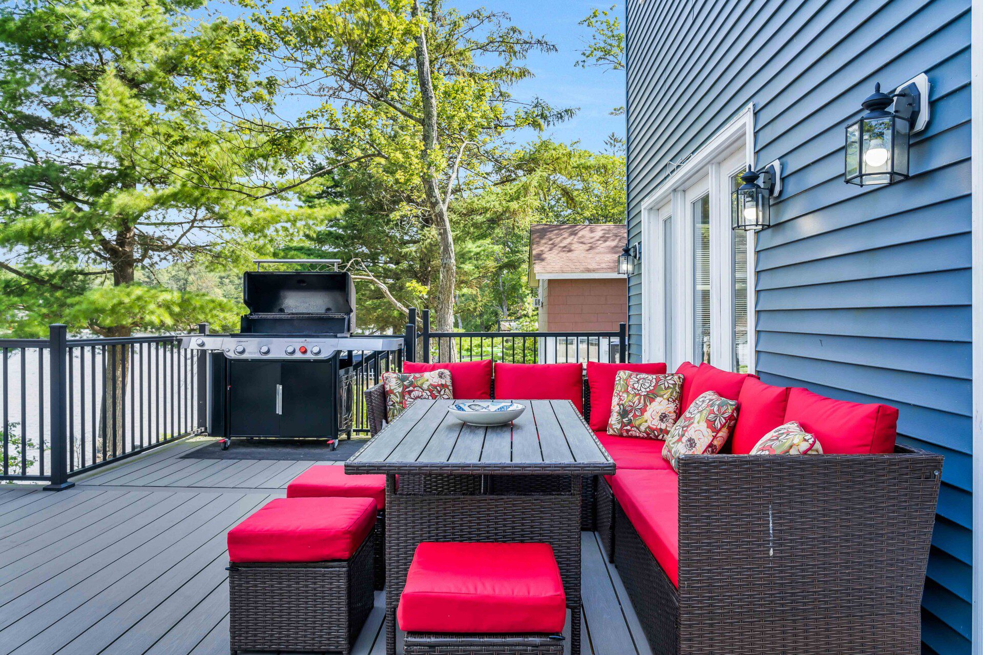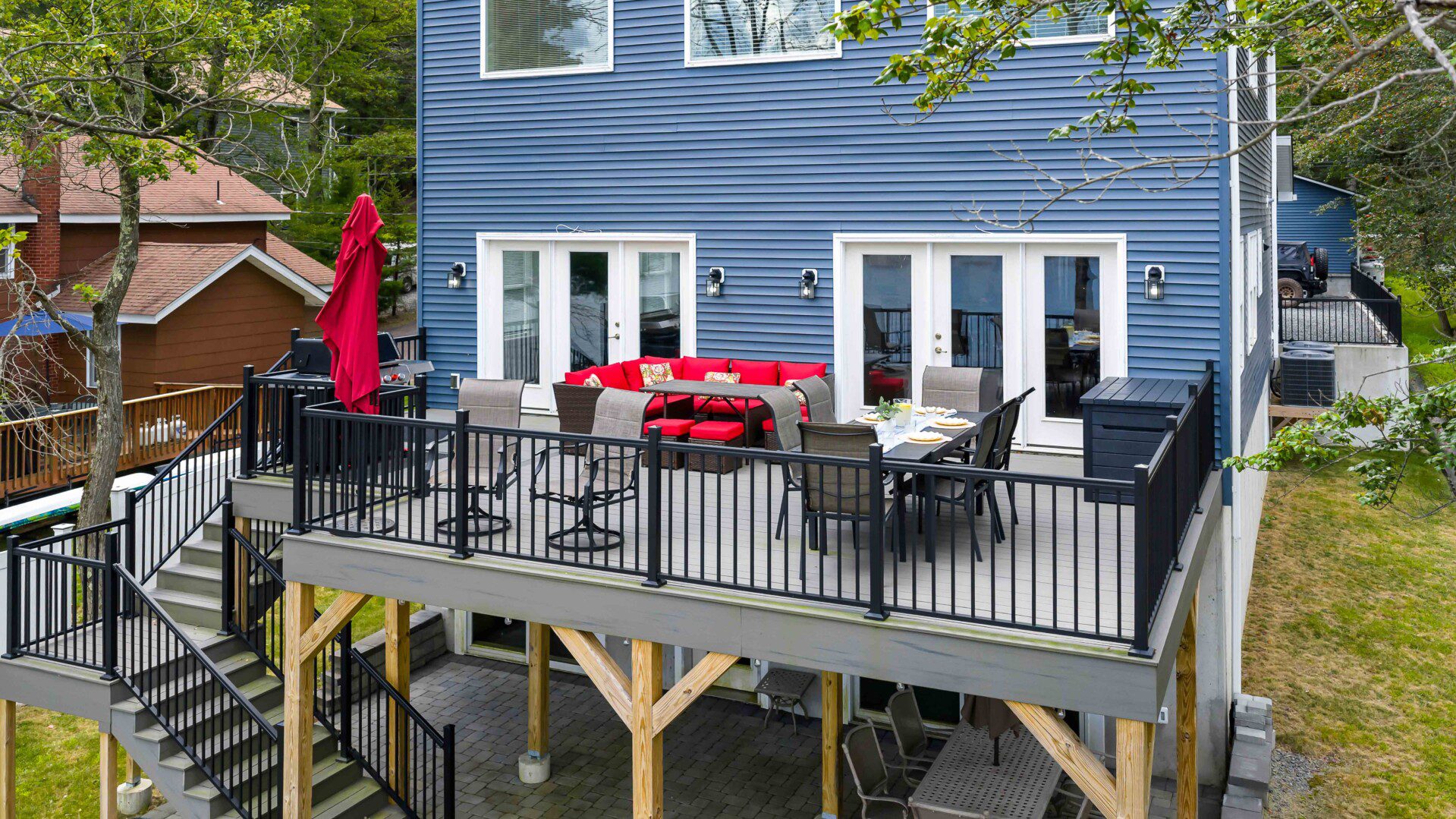 Upstairs deck features a large dining table, couch seating, propane grill, umbrella for shade, and stunning lake views