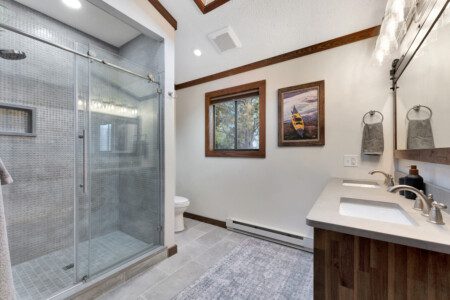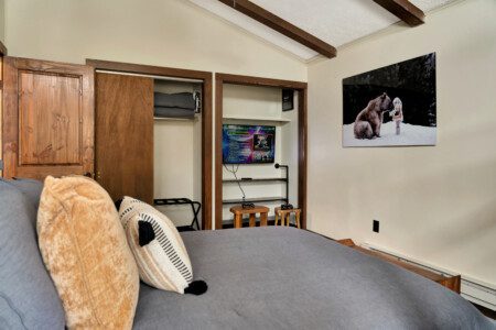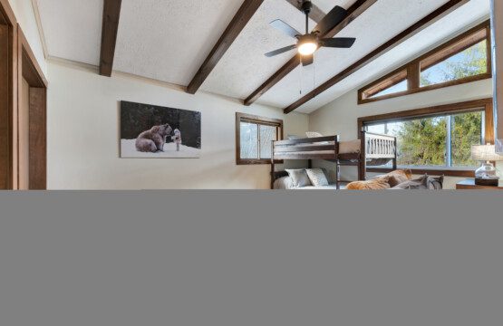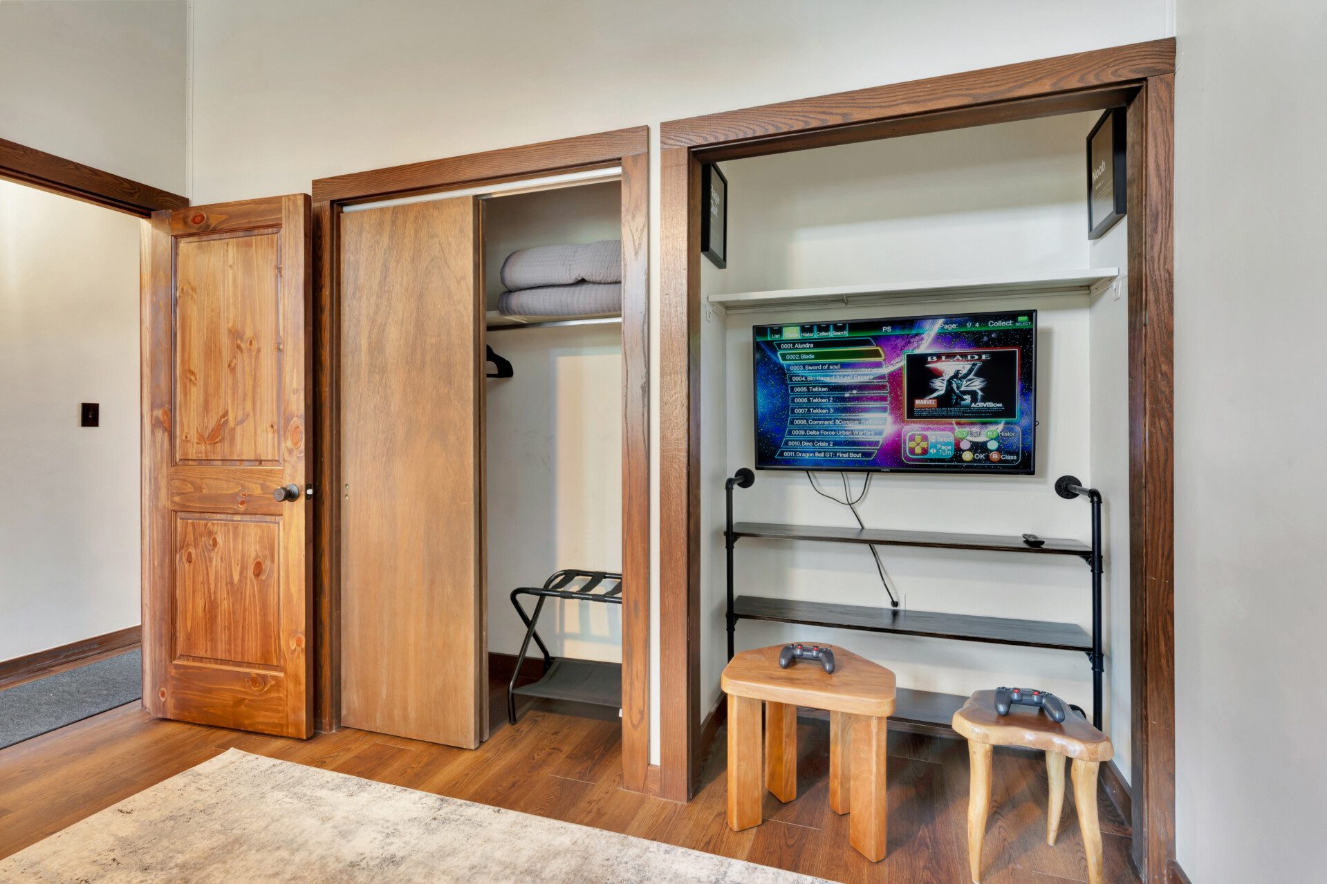 Bedroom #4: Bunk beds with 2 full-sized mattresses, and a queen sized bed. Check out the bear smelling the little girl’s photo in the wall photo (that is a real photograph!). This room has a 50″ TV that has a gaming console attached with over 1,000 games to choose from – even the old school ones, like Pacman and Galaga, and Frogger! There are 2 controllers for your usage.