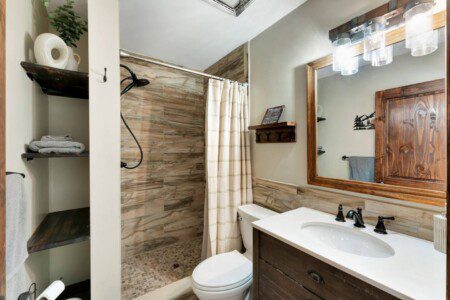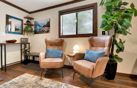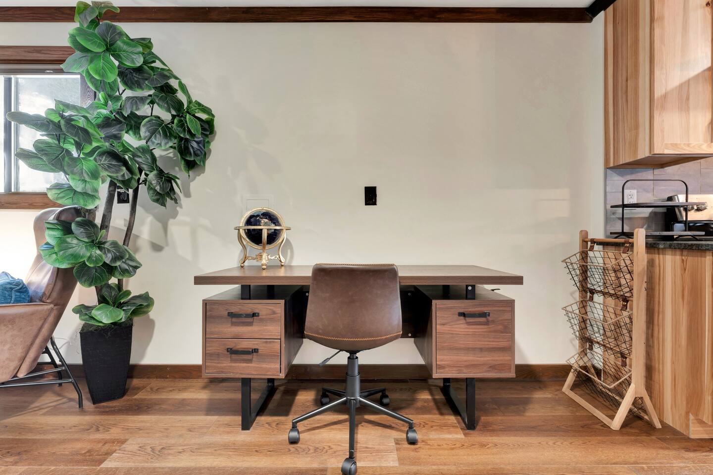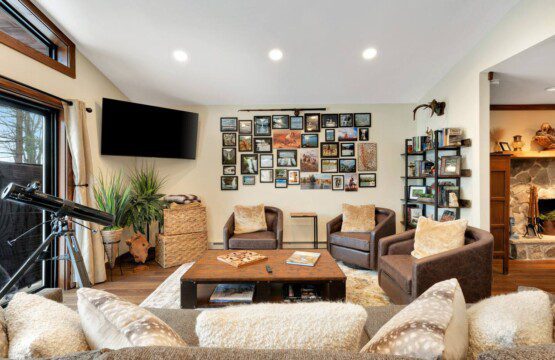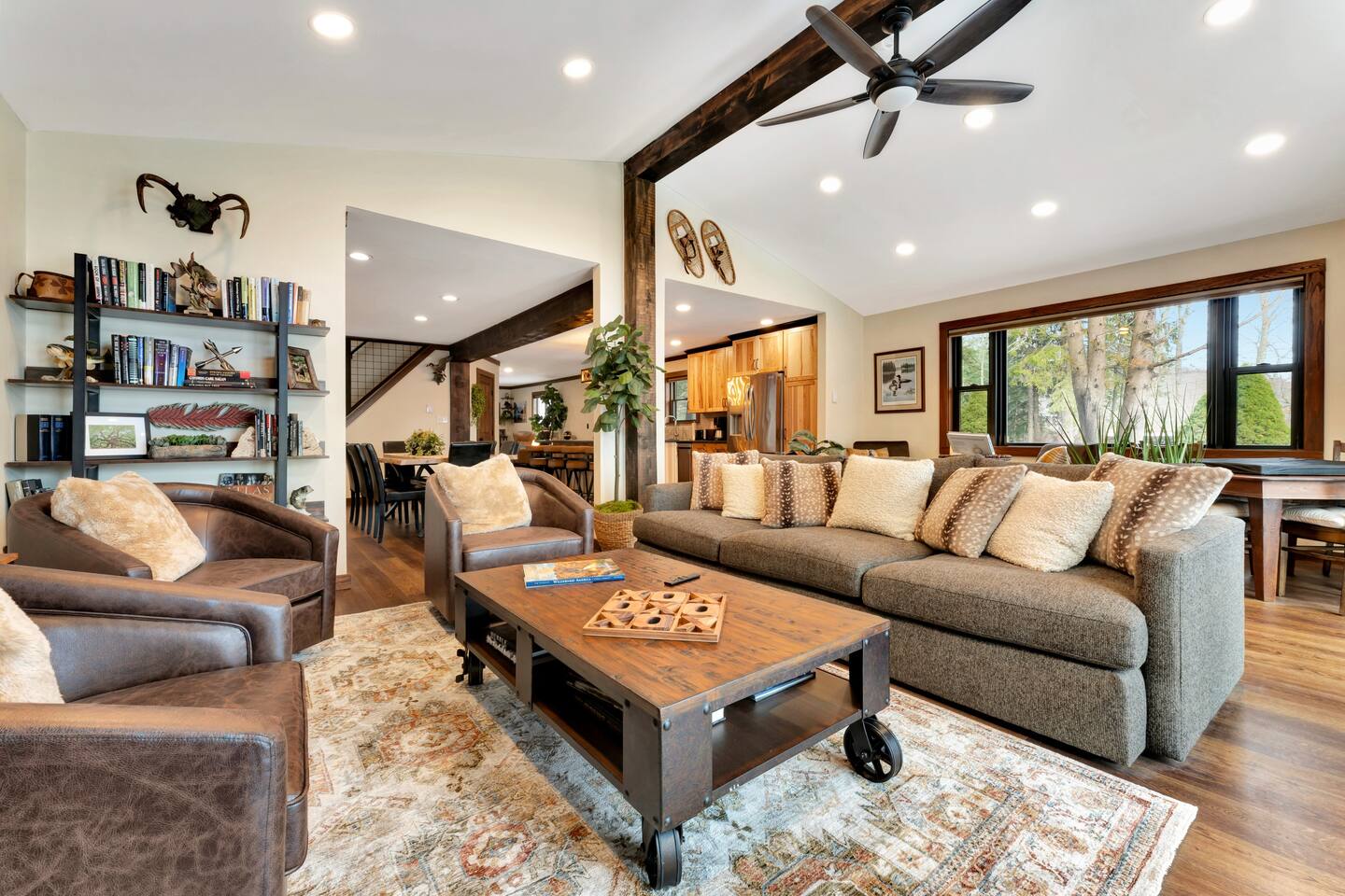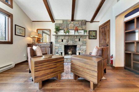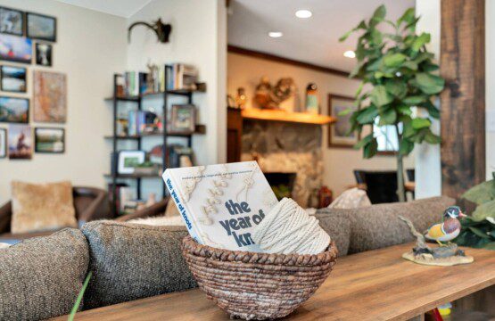 In the living room, relax in front of the 60″ Smart TV or enjoy a friendly game of Carrom on the wooden poker table. Browse through a selection of books, or admire the Native American-inspired picture wall, adding a unique touch to your fall stay. Please note that fireplaces are not functional at this time.