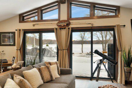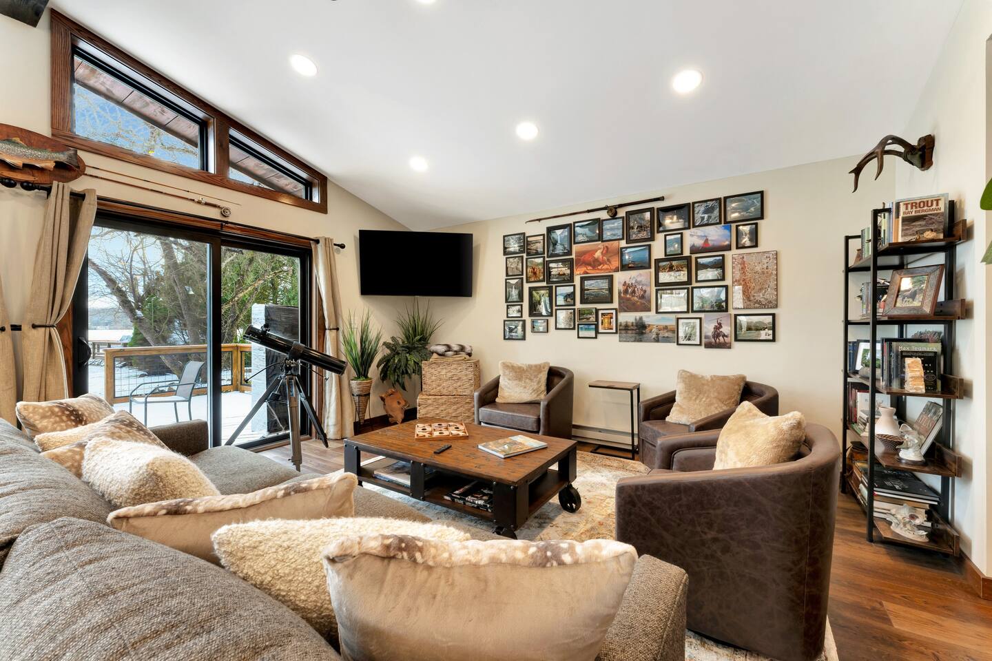 Step inside to find a welcoming living space featuring a rustic, mountain-inspired kitchen, dining area, and a dedicated workspace. Slide open the doors and let the crisp winter air greet you as you take in the serene beauty of our lakefront backyard, nestled along the shores of Lake Watawga.