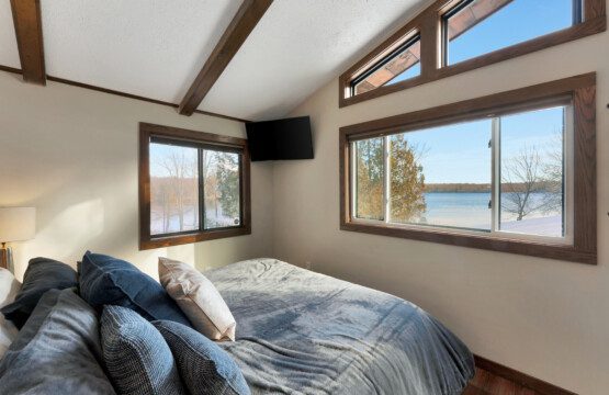 ● Bedroom #2 (Master): King-sized bed, 50″ Smart TV, private full bathroom, backyard and lake views