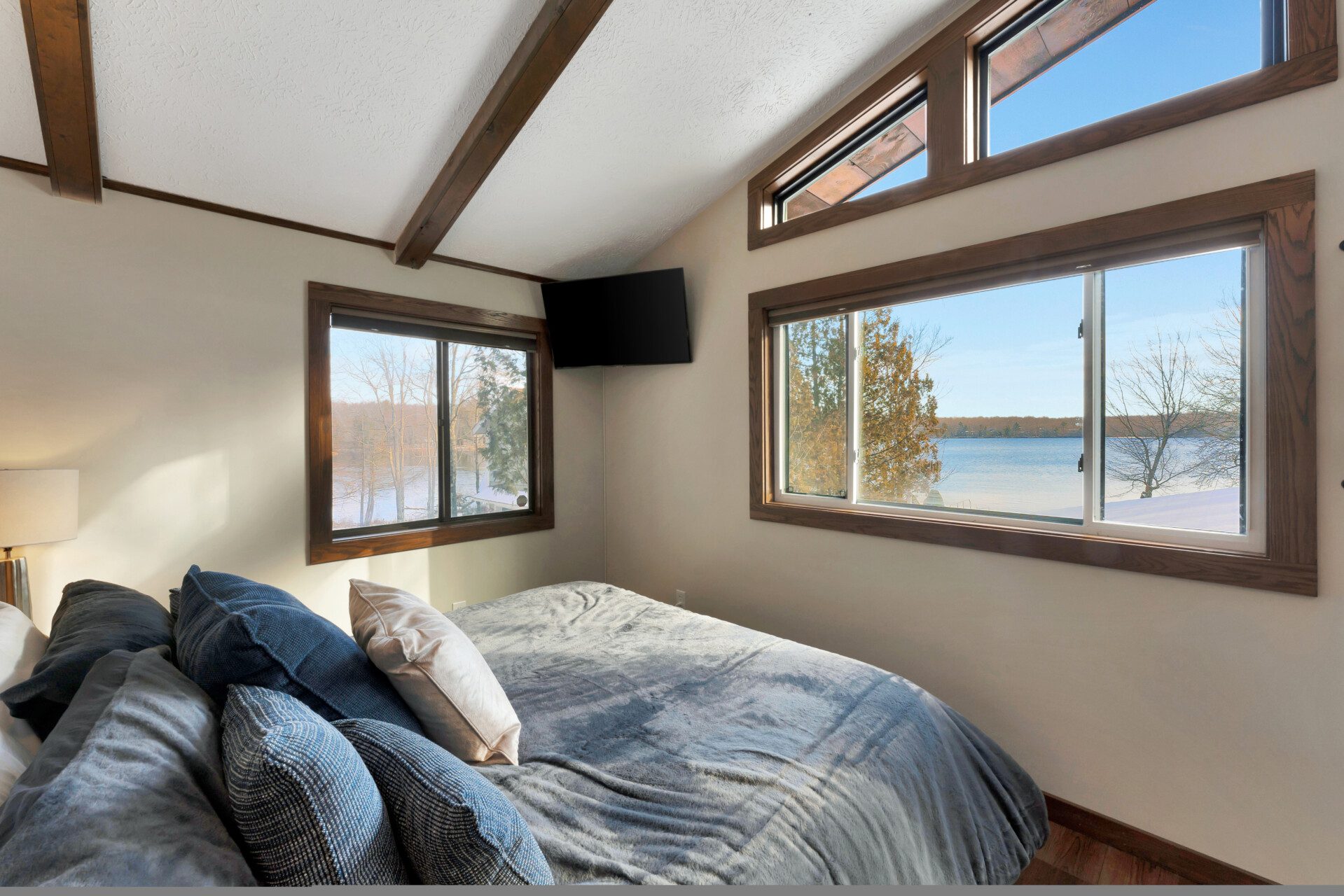 Bedroom #2: Indulge in luxury in our Master Bedroom, boasting a king-sized bed, 50″ Smart TV, private full bathroom, and sweeping views of the backyard and lake. Note: the fireplace in this room is currently non-functional.
