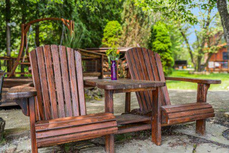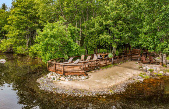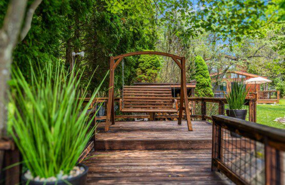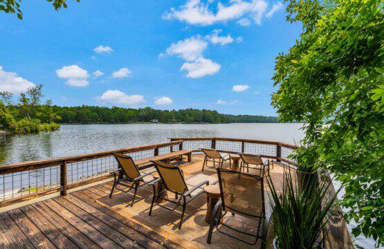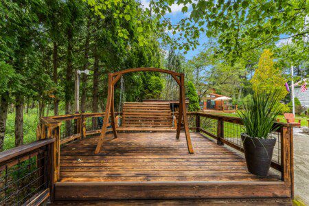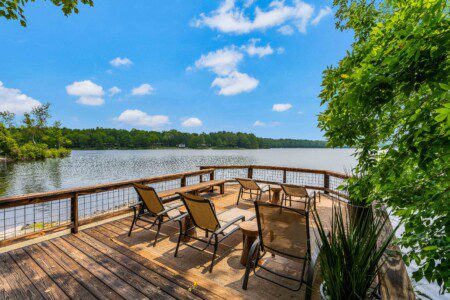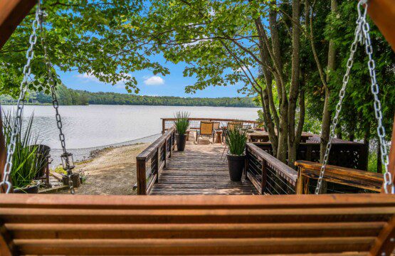 Large deck with a wooden chair swing and lounge chairs for soaking up the sun and upfront views of the lake