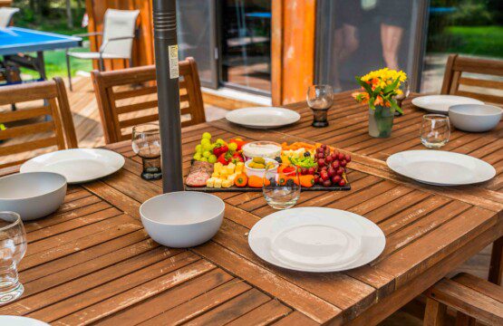 Outdoor dining area for 8 people with umbrella for shade