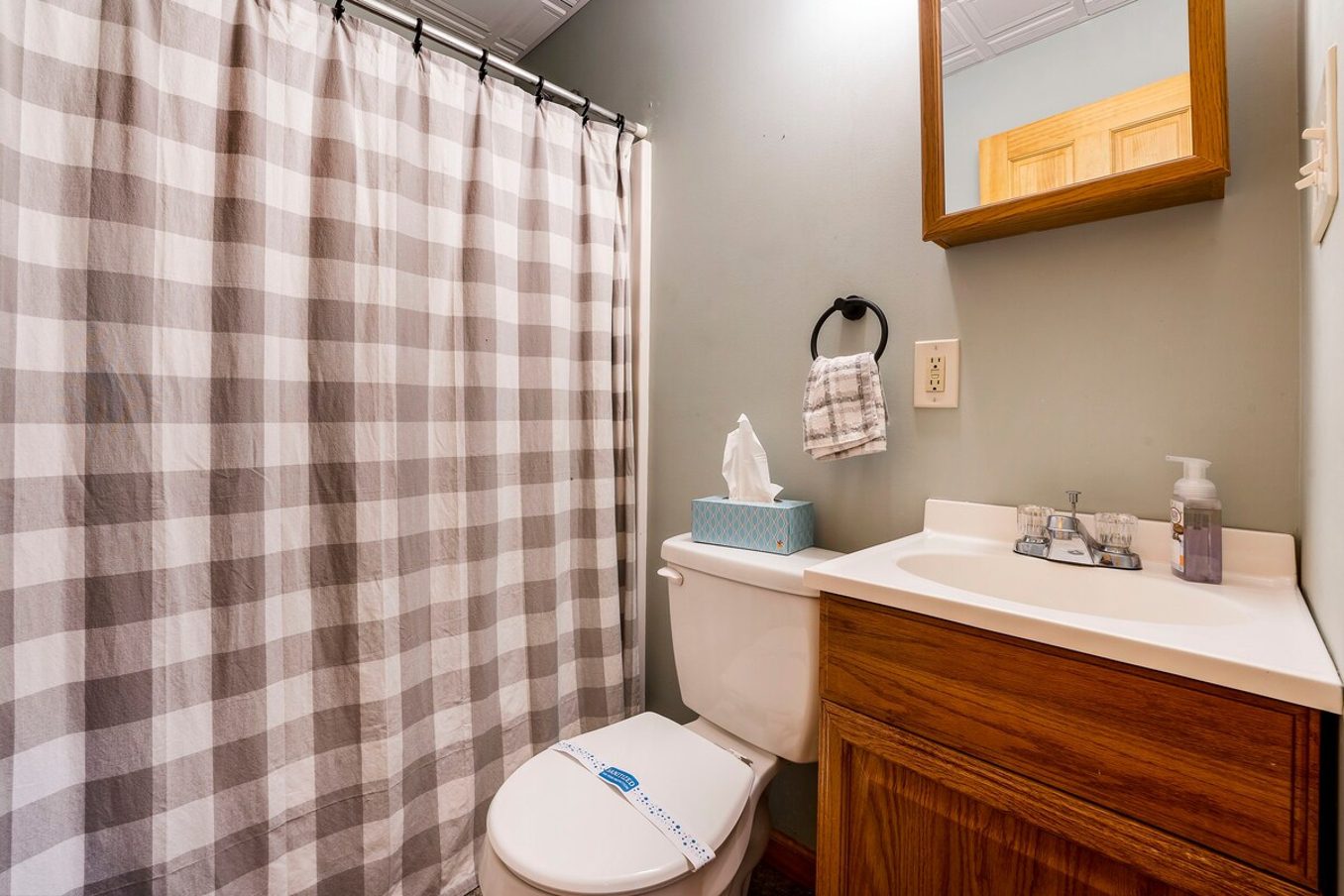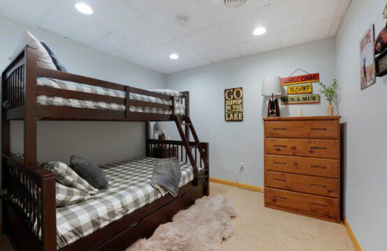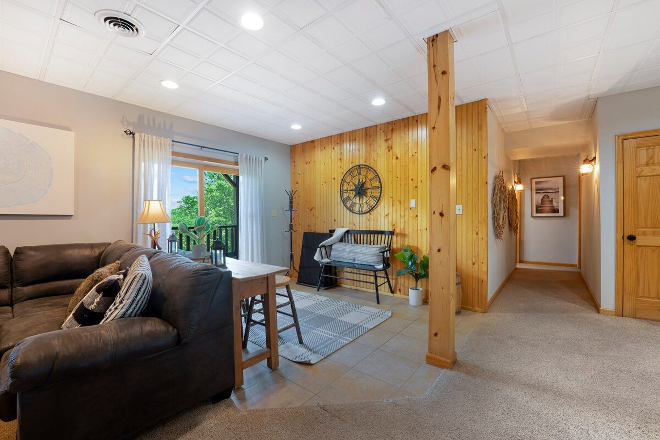 Downstairs: Find bedroom #4 with a queen-size bed and bedroom #5 with bunk beds (twin on top and full-size bed on the bottom with a pull-out trundle bed for extra space). The second living room includes a TV, a sectional couch, and a foosball table. A full bathroom and sliding door entrance lead to the lower-level deck, providing access to the swinging chairs, hot tub, firepit area, outdoor stairs, and garden.