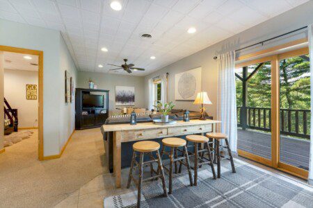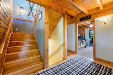 Main Floor: This spacious 3,000 sq. ft. home welcomes you through the front entrance, leading to three inviting bedrooms, each with its own private deck entrance for a serene retreat in nature.