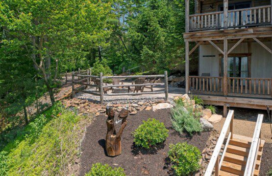 Explore our new outdoor stairs that overlook our extensive garden and handcrafted wooden sculptures of bald eagles, leading to a private walking trail (the trail does not lead to the lake).