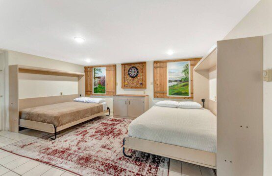 Second Living Room: Features two queen-sized pull-down Murphy beds, a 50″ Smart TV for movie nights, and a dartboard with a unique wine cork backboard. Sliding doors provide direct access to the backyard for easy indoor/outdoor enjoyment.