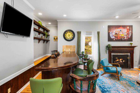 Downstairs, you’ll find one of our favorite spaces — a full entertainment lounge complete with a bar, bar stools, shuffleboard, billiards, foosball, and a brand-new poker table along with select board games. Comfortable couches surround the fireplace, making it a perfect hangout spot. Don’t miss the stunning Great Pyrenees mural, hand-painted by a local artist, that brings the room to life.