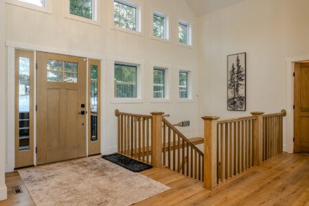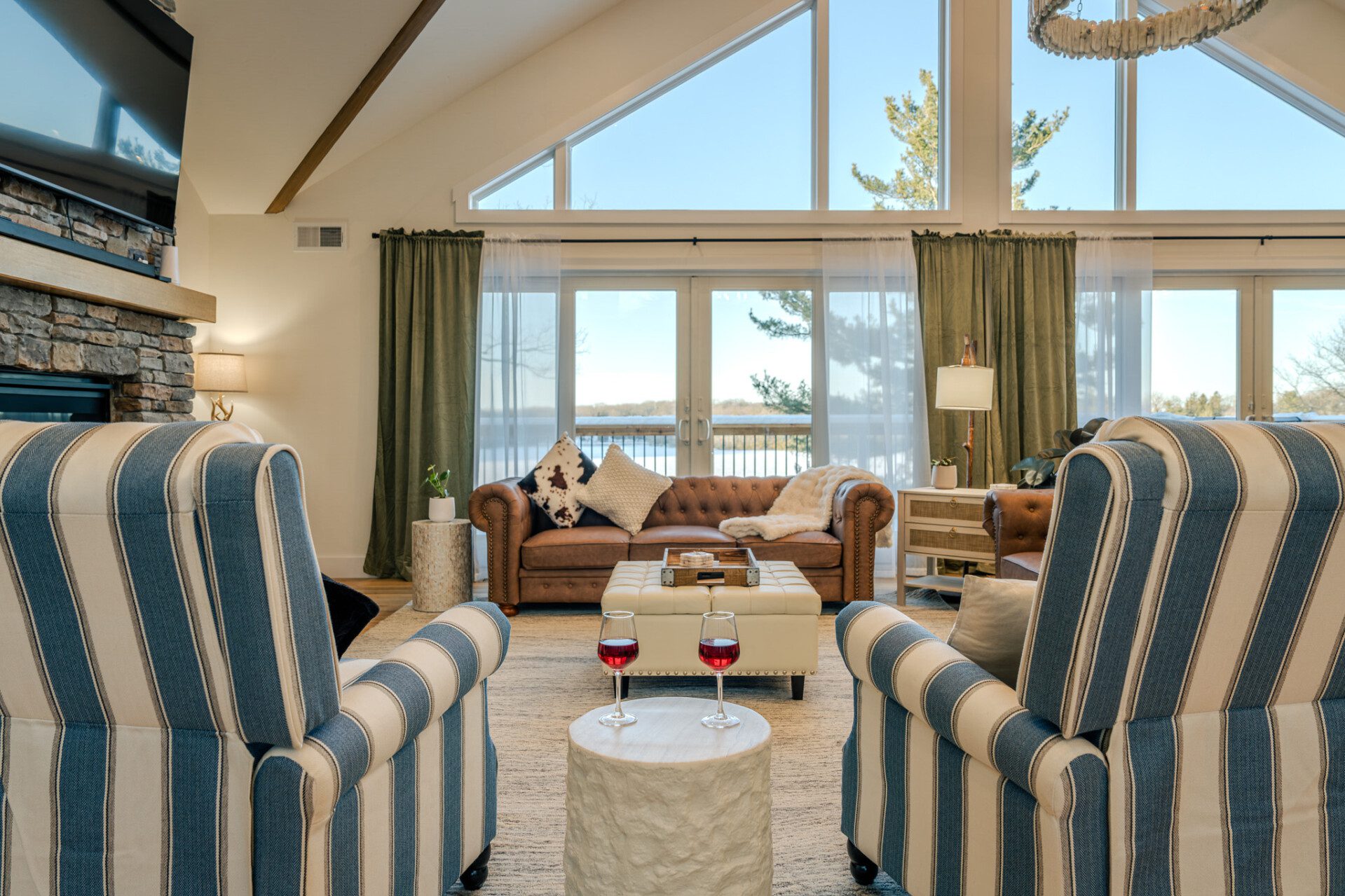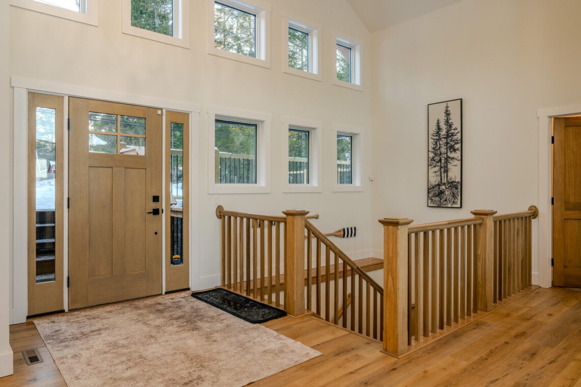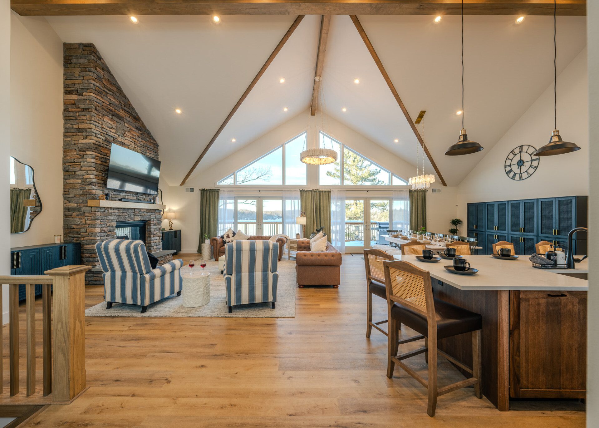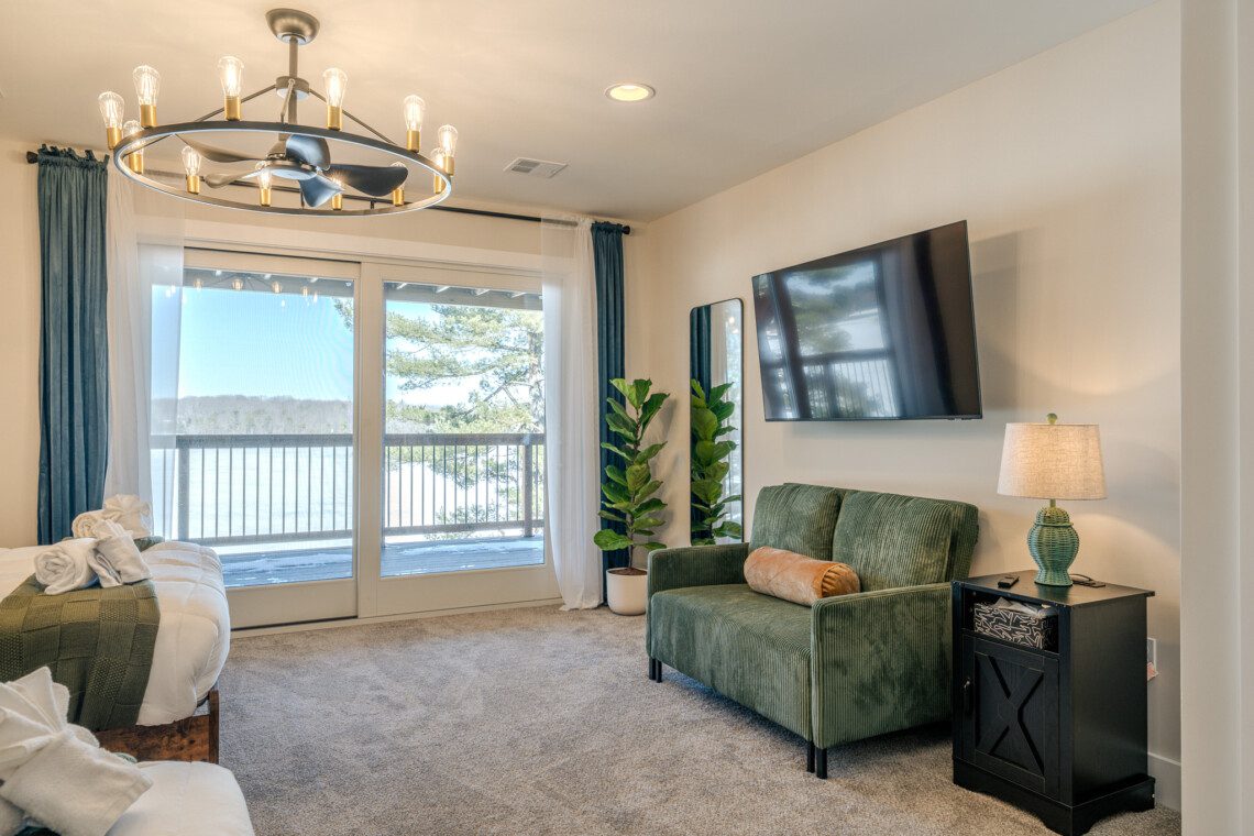 ● Sliding glass doors leading to the upper-level deck with panoramic lake views