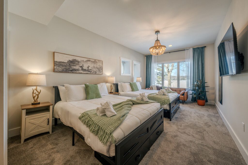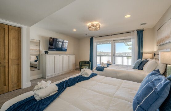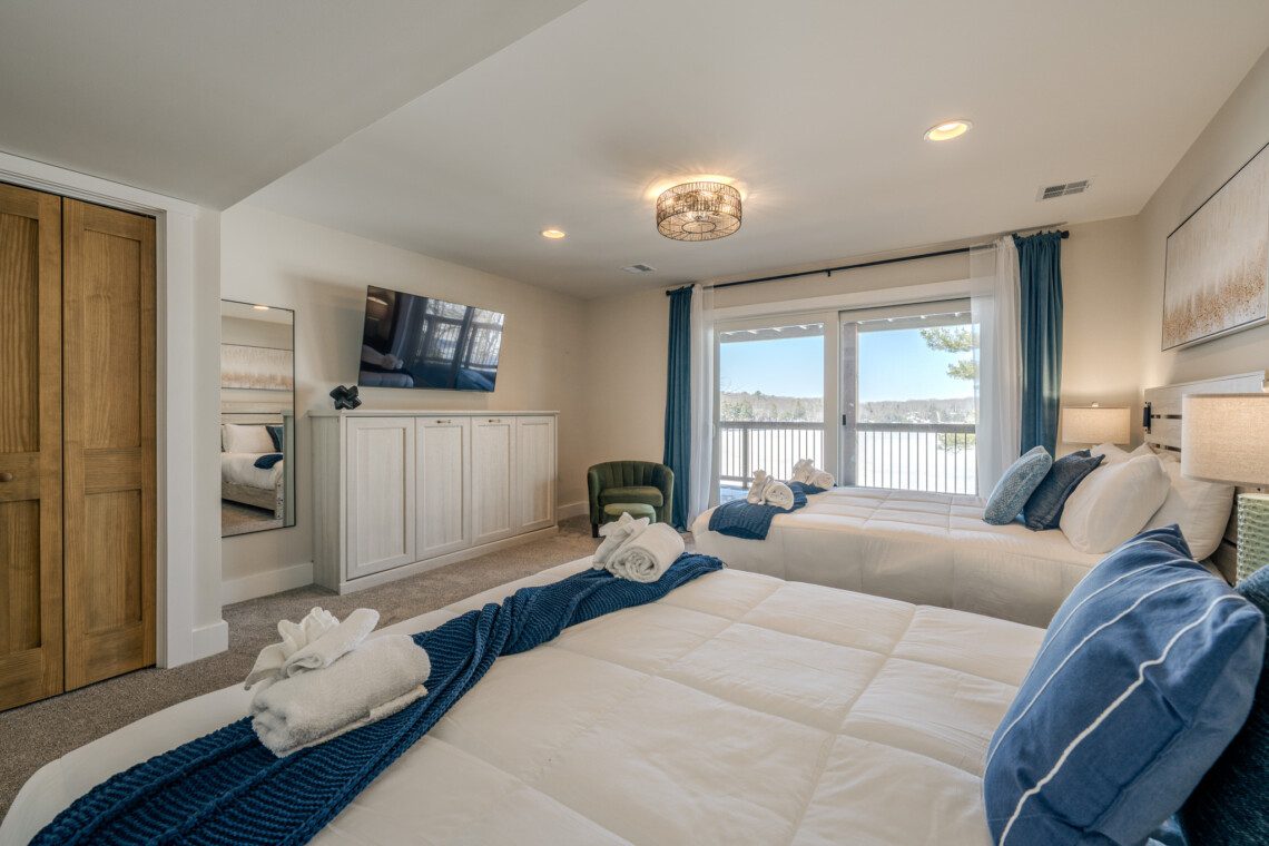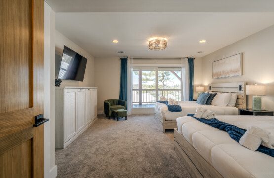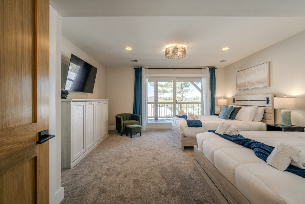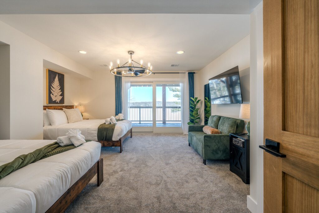 ● Bedroom 6: Two queen beds + fold-out loveseat with sliding-door access to the deck