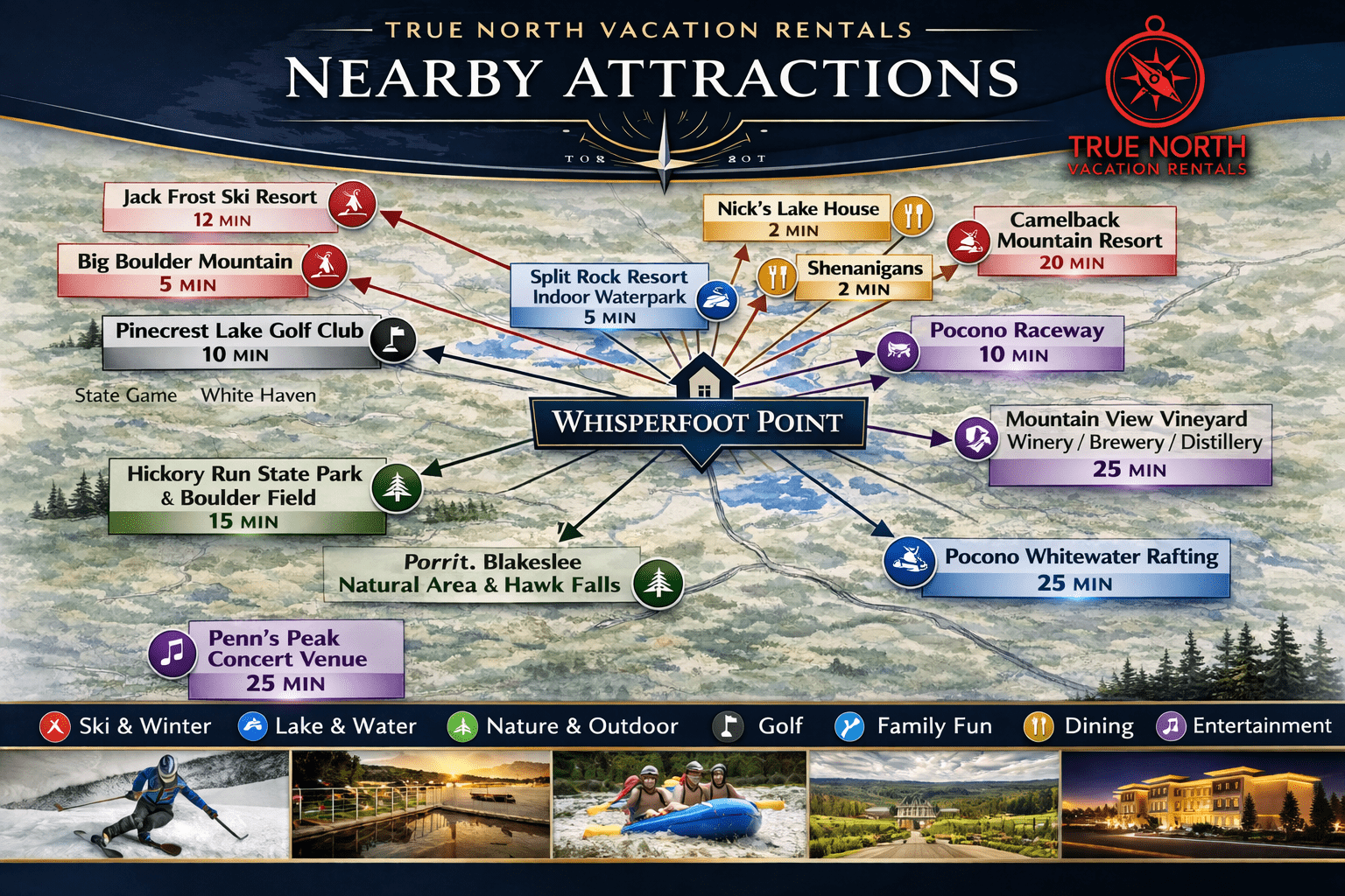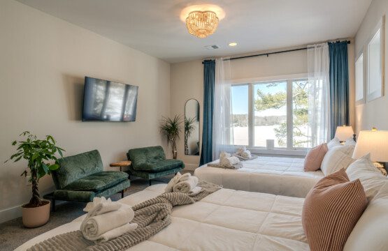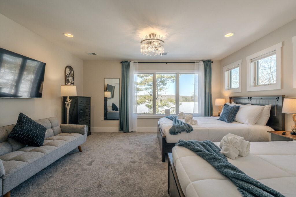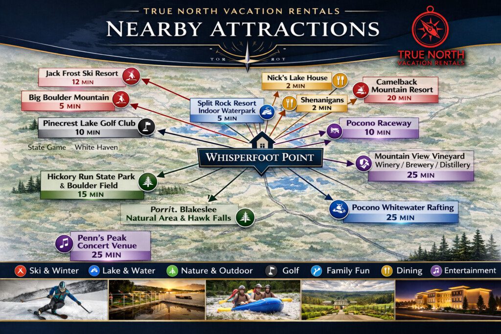 Welcome to Whisperfoot Point, a brand-new luxury lakefront estate. With soaring ceilings, walls of glass, and panoramic water views, this one-of-a-kind retreat blends modern architecture with warm mountain elegance. Designed for elevated group getaways, it offers expansive gathering spaces, private lake access, and spa-style amenities. The atmosphere is effortless, refined, and truly exceptional—experience elevated living at Lake Harmony.
