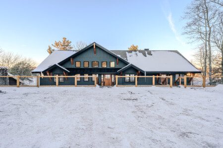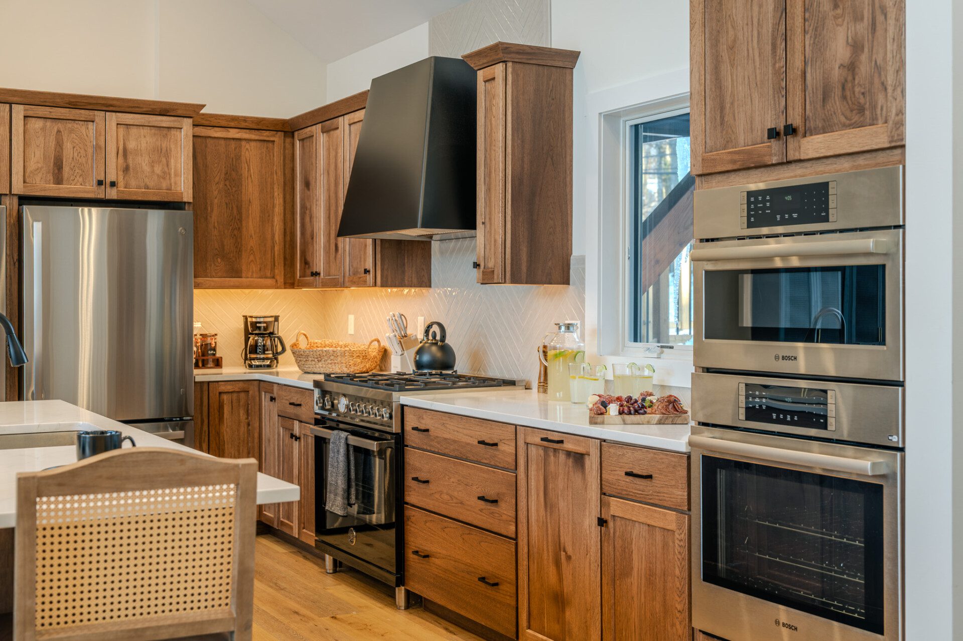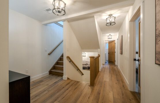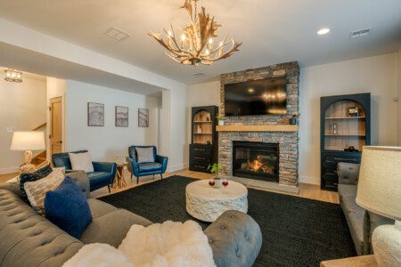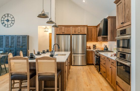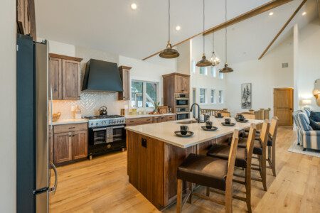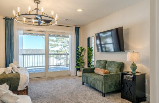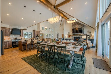 The top level serves as the heart of the home, featuring the main entry and primary gathering space. A dramatic A-frame glass wall frames the lake, while cathedral ceilings enhance the open feel of the space. Comfortable seating surrounds a propane fireplace, creating a warm and inviting atmosphere. The chef’s kitchen includes an oversized island, dual refrigerators, and two dishwashers, making it ideal for large groups. A spacious dining area allows everyone to gather for meals and celebrations, and sliding glass doors lead to the upper deck with panoramic lake views. A mudroom off the kitchen provides convenient storage for coats, shoes, and outdoor gear.