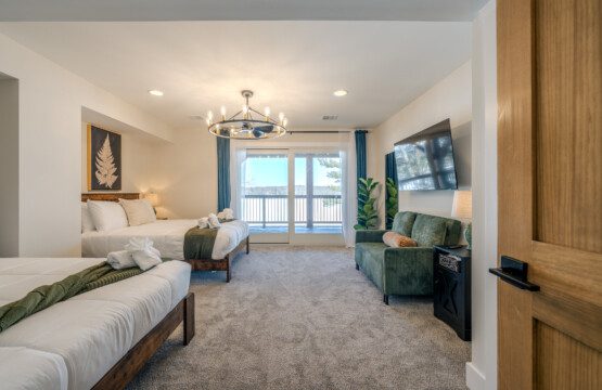 Bedroom 6: Two queen beds with a fold-out loveseat and sliding-door access to the deck